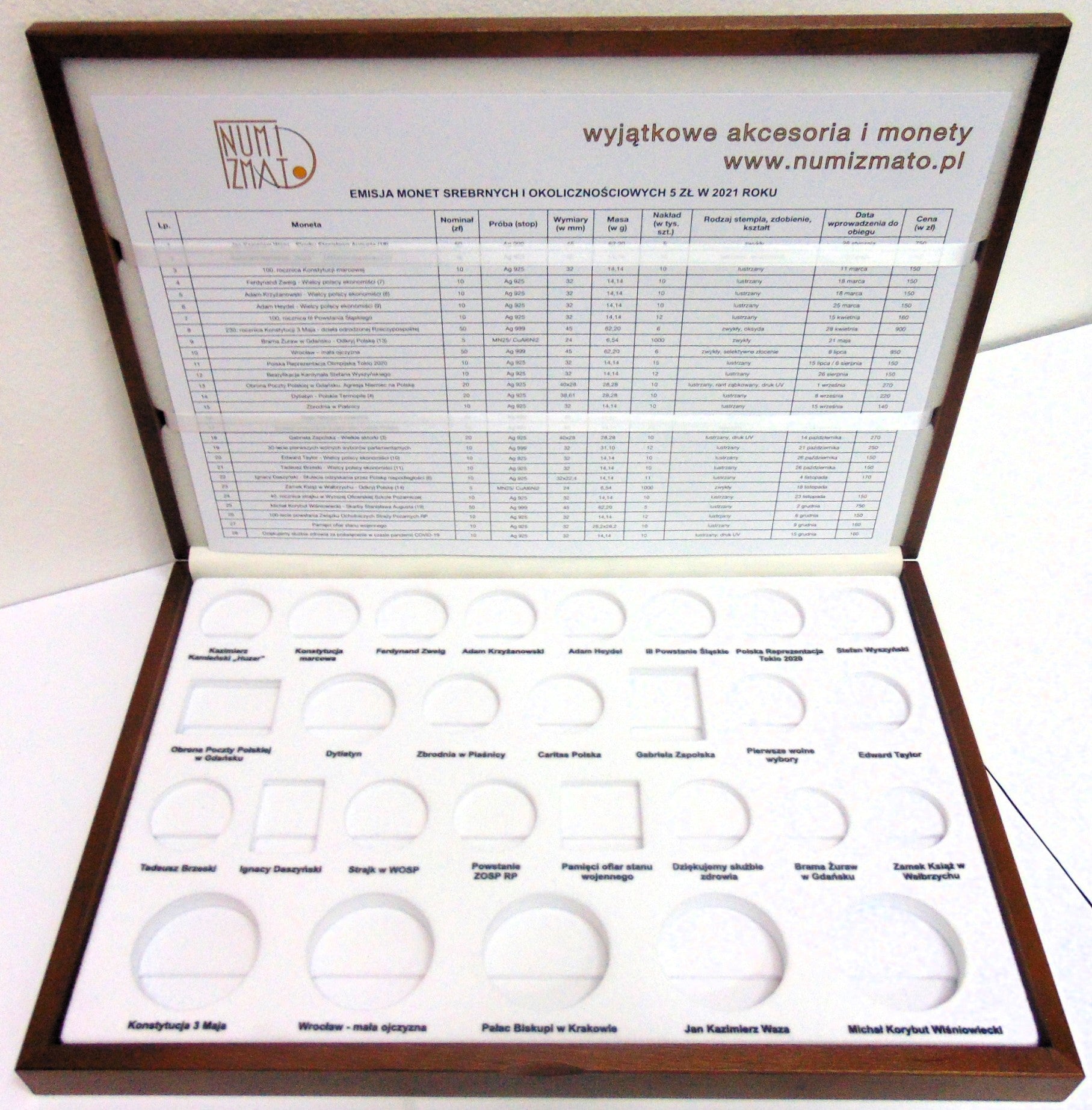 Zastanawiałeś się jak będziesz przechowywał monety, które zbierasz? My też i znaleźliśmy na to sposób - etui na monety srebrne i 5 zł 2021 r. (w kapslach). Dlaczego DE LUXE - sam zobacz - podpisy po monetami, miejsce na folder, plan emisyjny lub własne notatki, materiały najwyższej jakości. I to nie wszystko monety są w niej ułożone w logocznej kolejności. Widziałeś, aby ktokolwiek taką posiadał? Nie widziałeś!