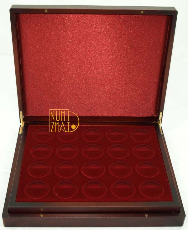 Kasety wykonane są z wysokiej jakości mahoniu i posiadają 3 "tacki" do przechowywania monet w systemie "piętrowym". Wewnątrz wykończone są flokiem w kolorze bordowym. Przeznaczone do monet 20 zł Ag w kapslach NBP